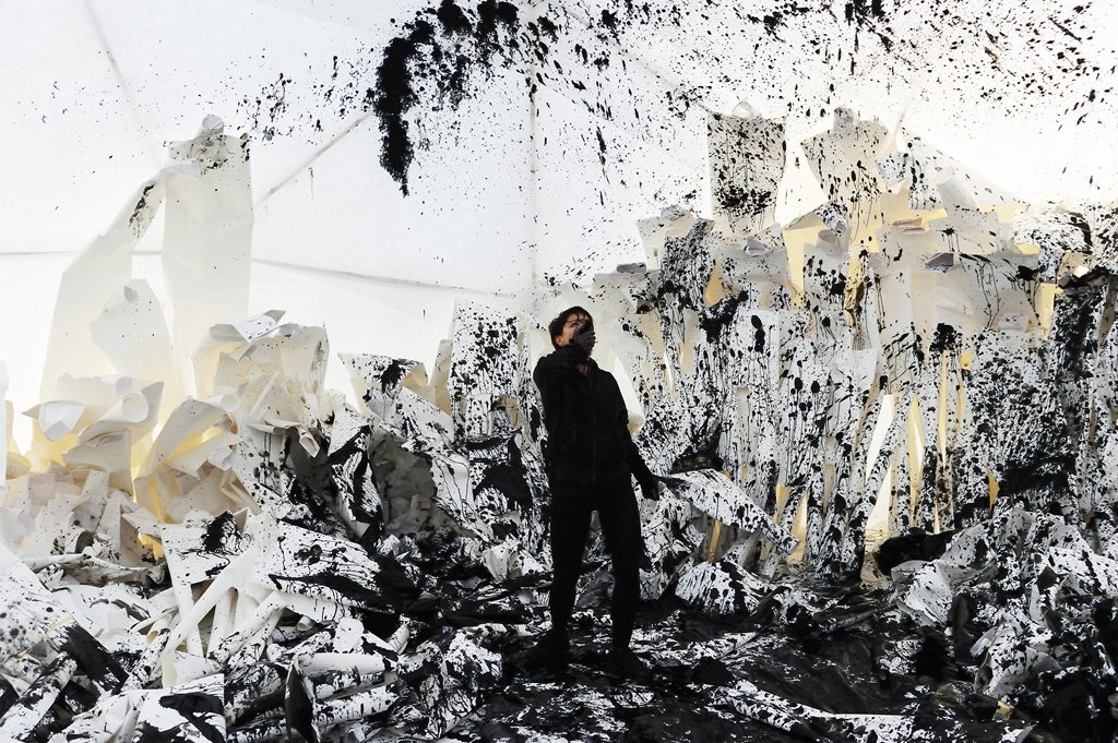 Anastasia Ax, artista visiva, lavora a Stoccolma. La sua ricerca ruota attorno ai concetti di costruzione e decostruzione, e alle forze compensative che scaturiscono da questi due poli, prima, durante e dopo il processo. Le sue monumentali installazioni si focalizzano sui processi di trasformazione, come un continuo flusso ed evoluzione senza fine, dando luogo ad un’energia viscerale che libera e rappresenta la circolarità della vita e della storia. Carta, gesso e inchiostro esprimono, per Anastasia Ax, una duplice valenza, in quanto elementi naturali e simboli della nostra cultura. Essi sono mezzi creativi per colmare il vuoto, ma anche elementi dell’animus, velenosi e melanconici. Riplasmando lo spazio, il corpo dell’artista diviene strumento di metamorfosi. Essere pronti a perdere il controllo e a distruggere, denota una capacità di distacco dalle cose, una contrapposizione al materialismo che avvicina l’artista alla filosofia buddhista e alla tradizione dei mandala. Compulsioni creative e violente coesistono simultaneamente: un terreno fertile può trasformarsi in campo di battaglia o in un apocalittico paesaggio urbano. I lavori di Anastasia Ax sono stati ospitati in numerosi musei e gallerie, tra i quali: Moderna Museet di Stoccolma, Marta Herford di Herford in Germania, Neues Museum di Norimberga, Serralves Museum di Porto. Per le sue azioni, Anastasia Ax si è avvalsa della collaborazione di sound artists e musicisti, tra cui Lasse Marhaug, C. Spencer Yeh, Lars Siltberg, Leif Elggren, Marja-Leena Sillanpää e Bill Kouligas.
